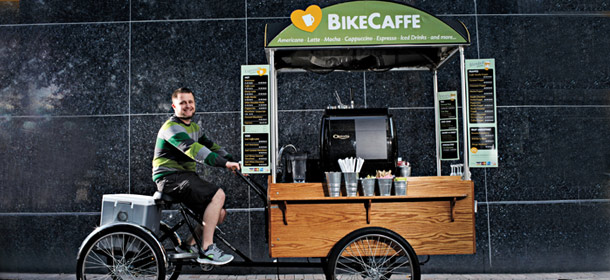 A franquia de carrinho de café é bem simples, consta de uma bicicleta e um mini quiosque adaptado. Mike diz que optou pelo negócio, principalmente pelo baixo custo do investimento inicial. Para ele seria muito caro investir em uma loja de franquia de café convencional.